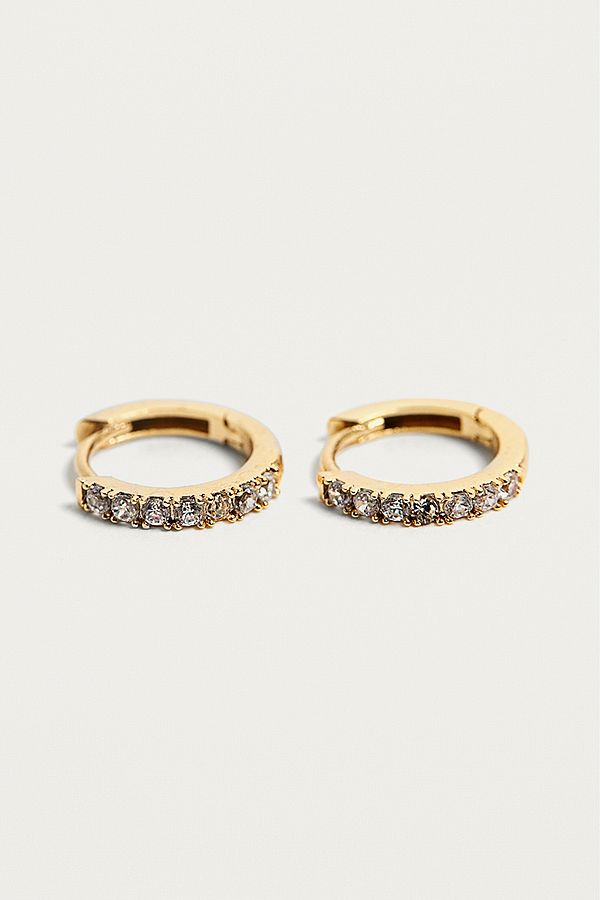 Rhinestone gold plated hoop earrings from British jewellery label Estella Bartlett. Tiny hoops get the luxe treatment with stones at the front. With a hinged closure.