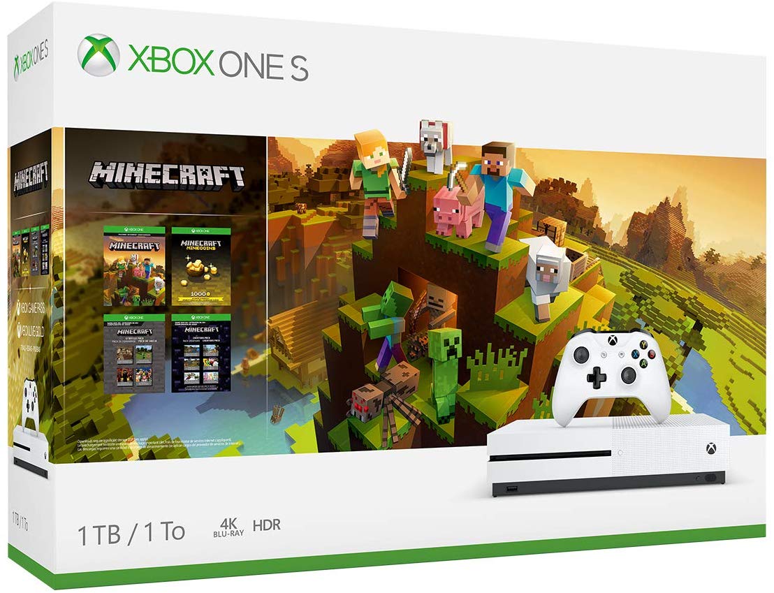 • Includes: 1TB Xbox One S console, wireless controller, full game download of Minecraft, Minecraft Starter, and Creators Pack, 1,000 Minecoins, 14-day Xbox Live Gold and 1-month Xbox Game Pass trial.